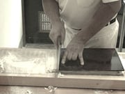 7.切りは、より切れる包丁で角が立つように切ります。そうすることにより口当たりが良く、コシもあるそばに仕上げます。